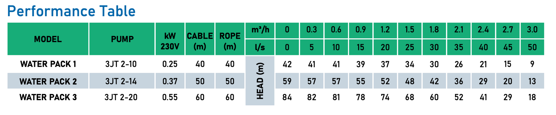 Pump Kit 2: JohnTech 2-14 3" | 0.37kW submersible pump pack. Optimum efficiency is 27 - 32 litres per minute (1,620 - 1,800L/per hour) at a depth of 45m - 50m.