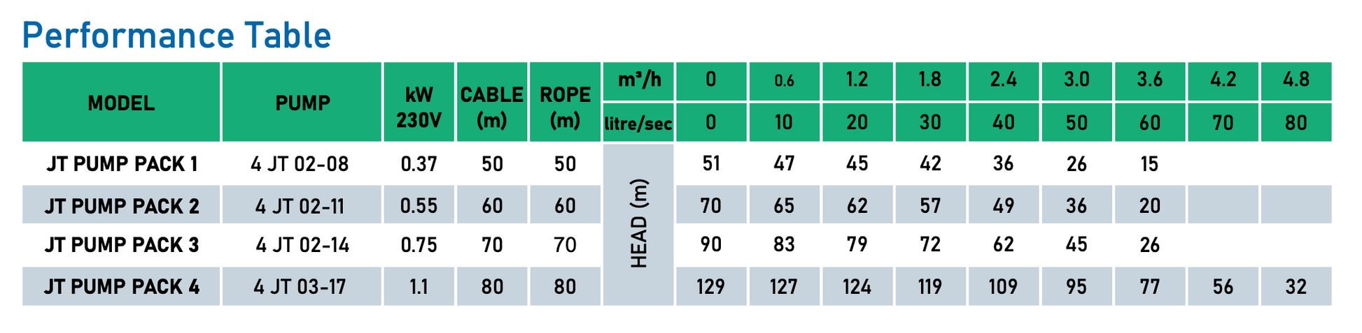 Pump Kit 4: JohnTech 3-17 4" | 1.1kW submersible pump pack. Optimum efficiency is 50 - 65 litres per minute (3,000 - 3,900L/per hour) at a depth of 70m - 95m.