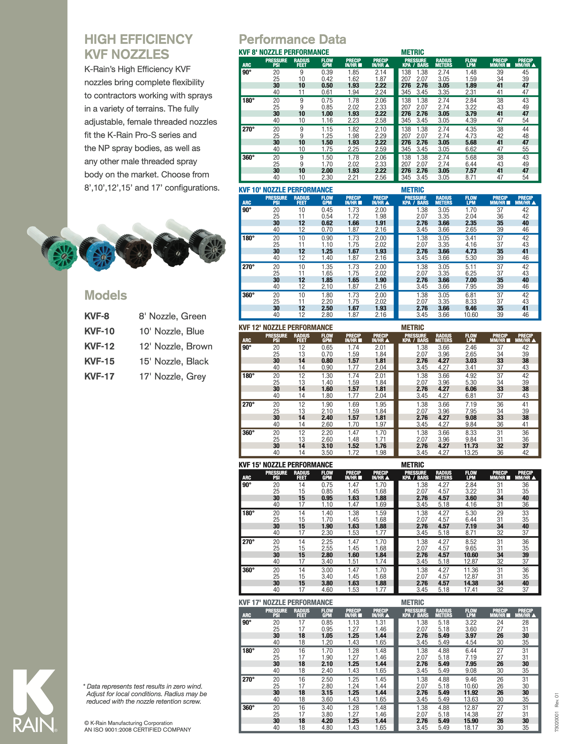 Trusted for long life, K-Rain KVF nozzles bring complete flexibility to contractors working with sprays in a variety of terrains. These fully adjustable, female threaded nozzles fit the K-Rain® Pro-S™ series and the NP Spray™ bodies, as well as any other male threaded spray body on the market. Radius options: 6', 8', 10', 12', 15' and 17' (1,8; 2,4; 3,0; 3,7; 4,6 and 5,2 m).