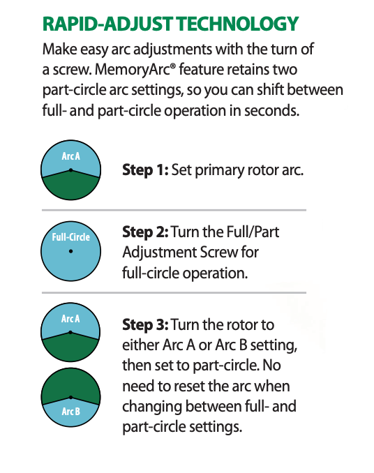 - Easy Arc Adjustments - Whether you’re catering to grow-in or just trying to get more from a limited water supply, Rapid-Adjust Technology in 552 and 752 rotors allow you to handle simple arc adjustments with the turn of a screw. MemoryArc® retains two part-circle arc settings, so you can shift between full- and part-circle operation in seconds.