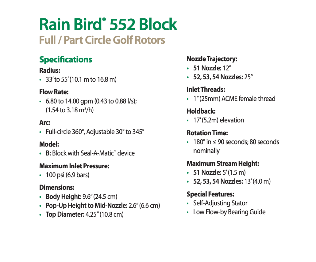 Rain Bird 552 Series block rotors are designed for the harsh conditions encountered in golf applications. Engineered for precise application and distribution uniformity, Rain Bird block rotors help you get the most from your water source.