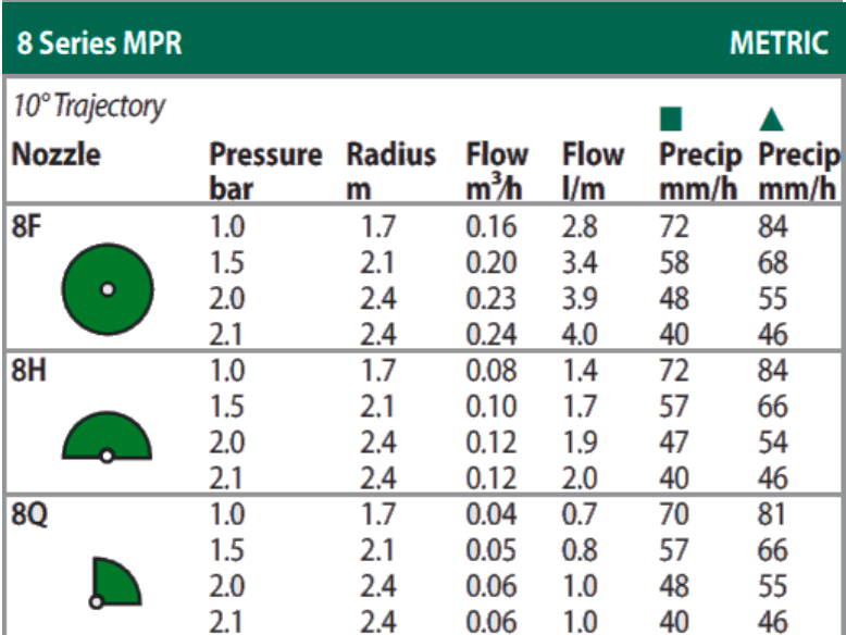 A wide selection of MPR nozzles is available so the distribution of water can be tailored to meet the unique and diverse needs of your landscape. MPR nozzles are designed to provide uniform coverage, ensuring that your lawn is green throughout, with no dry or brown spots.