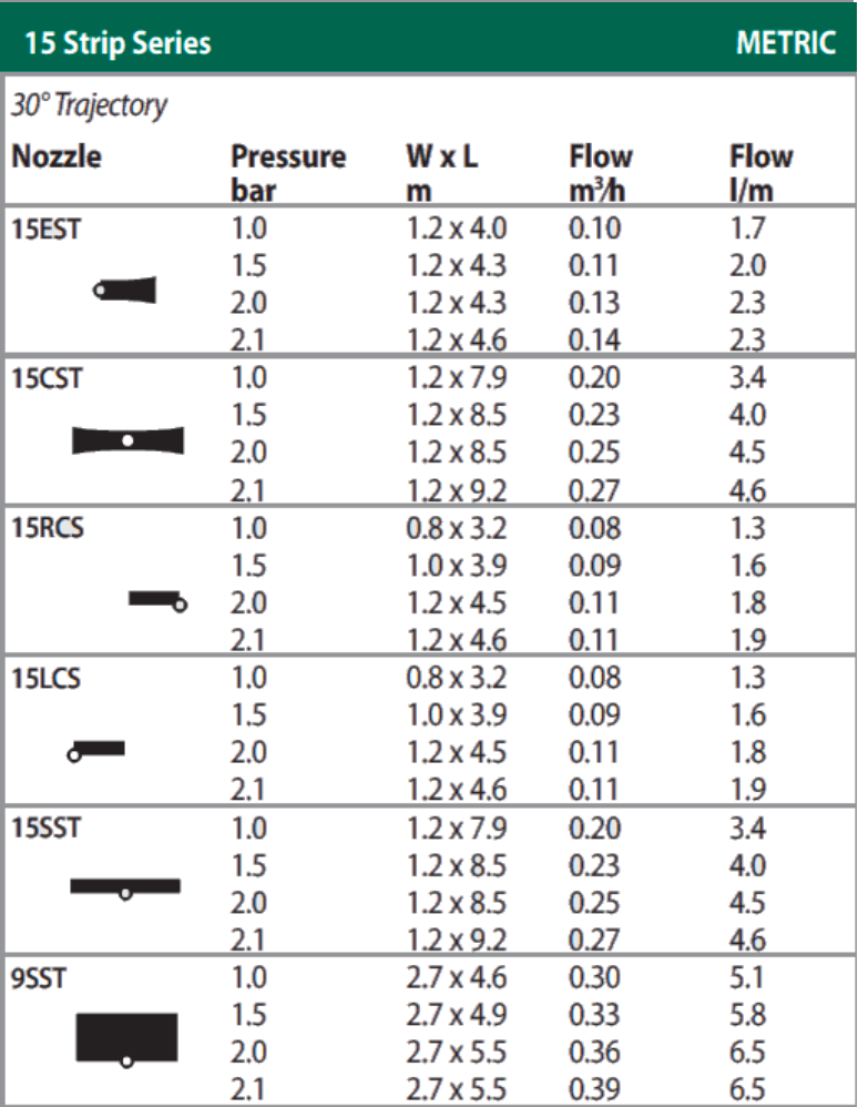 This is a 15ft Right Corner Strip Nozzle is is designed for irrigating the Right-hand corner of narrow areas, ensuring efficient water coverage without overspray. It produces a fan-shaped spray pattern that covers a rectangular zone extending outward from the left corner, making it ideal for sidewalk edges, medians, and garden borders.