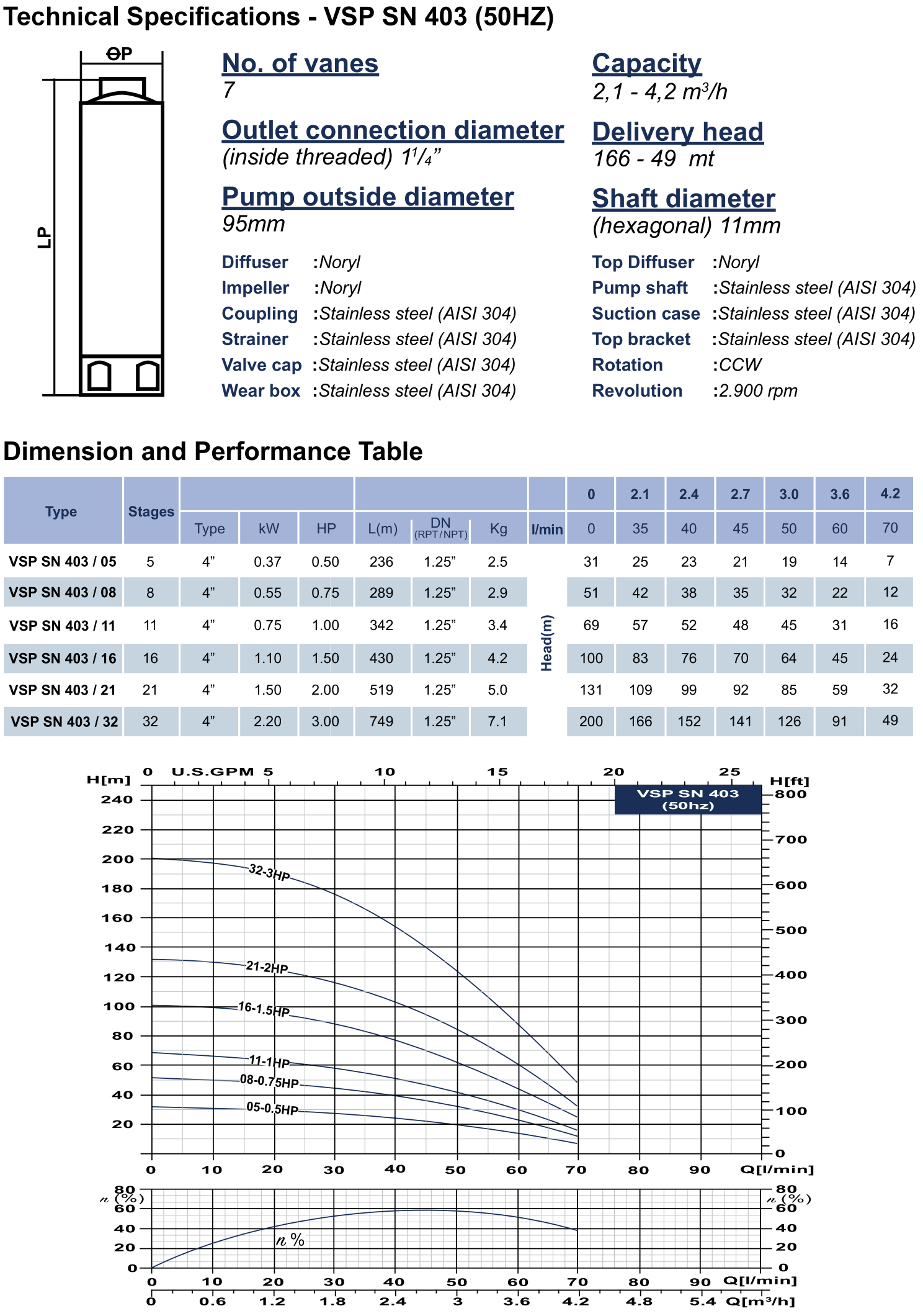The TESK 403 Series 4" (100mm) submersible pumps are designed for exceptional efficiency, durability, and ease of use. Ideal for borehole applications, these pumps offer consistent performance across various models. Although the 403 range can do between 10 and 70 litres per minute, its optimum efficiency is at 40-50 litres per minute at a depth of 20m - 175m depending on the model.