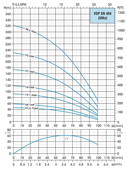 TESK 404-35: Optimum efficiency is 60 litres per minute (3,600L/per hour) at a depth of 170m. Pump range is 10L/min - 100L/min and a depth of 50m - 230m.